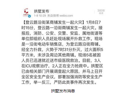 1月8日,上周末,杭州一家電動車賣場發生嚴重火災,造成5人嚴重受傷。
